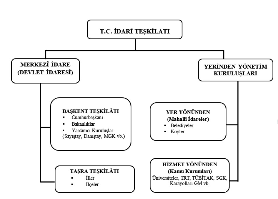 Merkezî İdare (Devlet İdaresi): Merkezî idare, “devlet tüzel kişiliği”ni ifade eder ve genel olarak yürütme yetkisi bu tüzel kişilik tarafından kullanılır. Merkezî idarenin de, başkent teşkilâtı ile…
