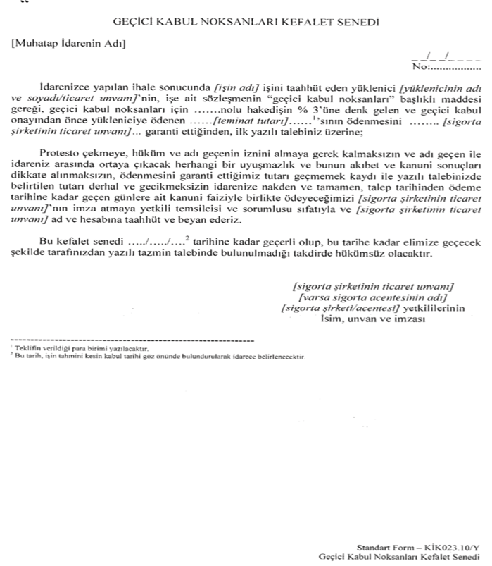 EK8 - Örnek Kefalet Senedi Formu - Kamu İhale Kurumu (Geçici Kabul Noksanları Kefalet)