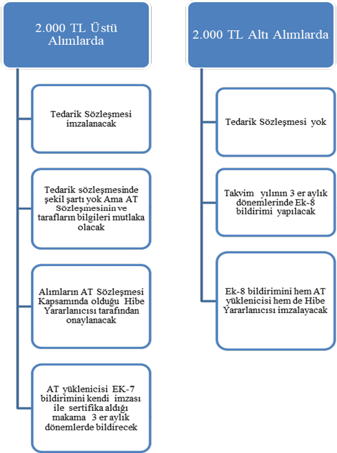 IPA ve IPA II kapsamında yükleniciler ve tedarikçileri arasındaki sertifika kullanılarak yapılan işlemlerde belli bir tutarı aşan işlemler için Tedarik Sözleşmesi yapma zorunluluğu getirilmiştir. Piyasa şartlarına göre düzenlenecek olan bu tedarik sözleşmelerinin Birlik Sözleşmesi ile bağlantısının kurulabilmesi için bazı gerekli bilgileri içermesi zorunlu olmakla birlikte şekli bir şartı yoktur. Şekil 4.5 ve 4.6’da IPA ve IPA II kapsamındaki tedarik sözleşmesi düzenlenme koşulları gösterilmektedir.…