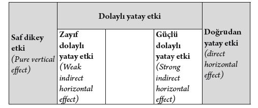 Tablo-1: İki kutuplu sistem düşüncesi, Stephen Gardbaum’un çalışmalarından alıntılanmıştır. Yazar, iki kutuplu spektrumun bir kutbuna saf dikey etki, diğer kutbuna ise saf doğrudan yatay etki modelini yerleştirmektedir. Dolaylı yatay etki ve bu modelin farklı görünüş şekilleriyse bu spektrum içinde farklı noktalarda bulunmakta ve uygulandığı hukuk sistemini dikey etki veya doğrudan yatay etki modeline yaklaştırmaktadır.(225)…